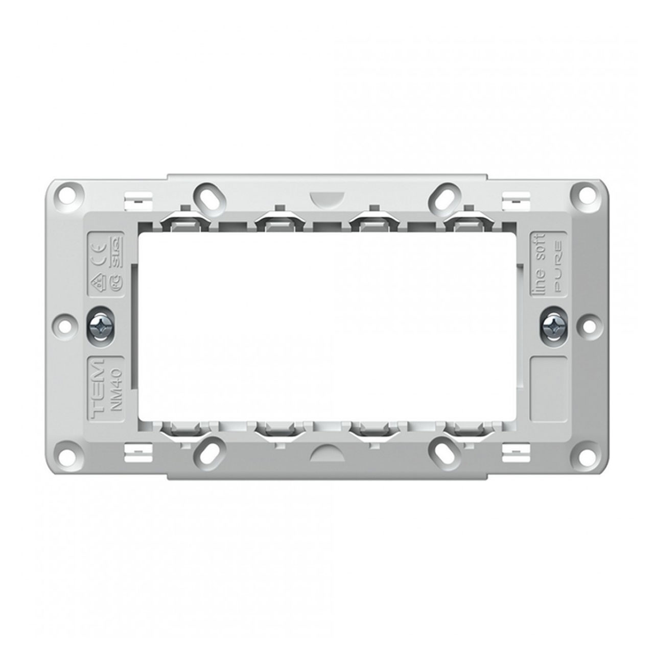 TEM Modul Line nosač 4M bijeli NM40 omogućuje ugradnju četiri modularna elementa iz TEM Modul Line sustava, osiguravajući pouzdanu i čvrstu osnovu za električne instalacije.